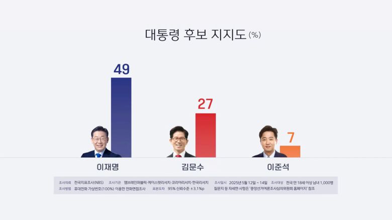 대선 후보 지지도가 더불어민주당 이재명 후보 49%, 국민의힘 김문수 후보 27%, 개혁신당 이준석 후보 7%라는 여론조사 결과가 나왔습니다.