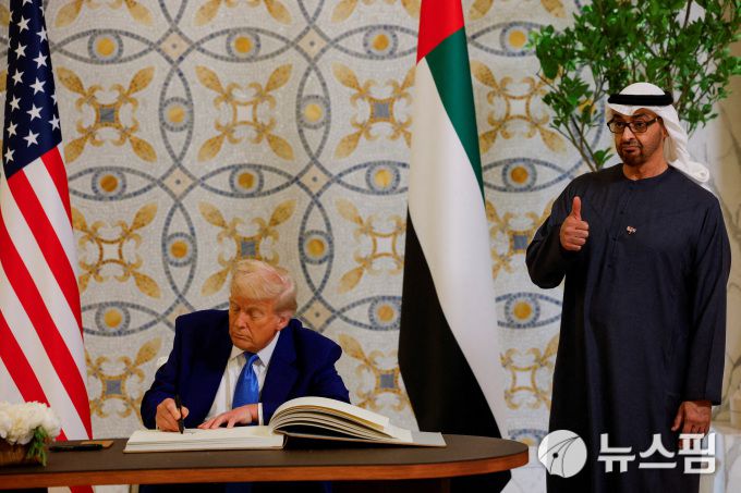 트럼프 대통령은 중동 순방 사흘째인 이날 마지막 방문지인 UAE의 수도 아부다비를 찾아 셰이크 무함마드 빈 자이드 알 나하얀 아랍에미리트 대통령과 정상 회담을 갖고 투자 협정에 서명했다.