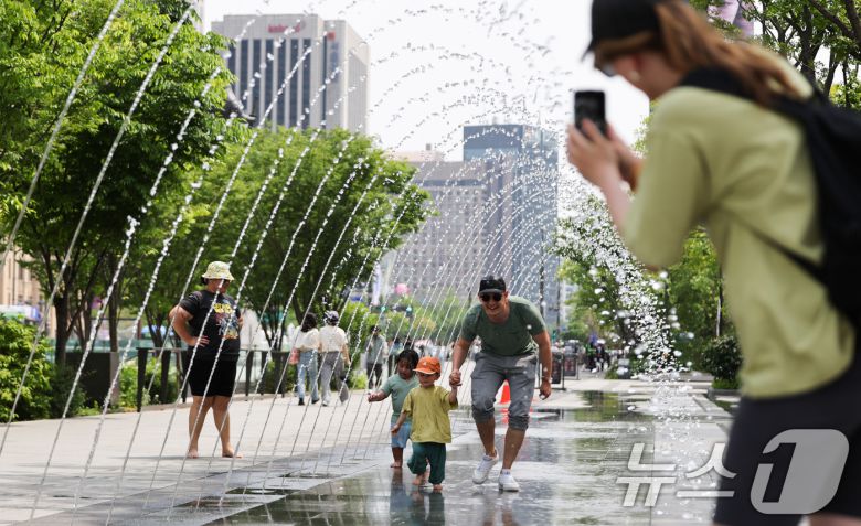 서울 낮 최고 기온 26도 등 초여름 날씨을 보인 14일 서울 광화문광장 분수터널에서 외국인 관광객들이 더위를 식히고 있다. 2025.5.14/뉴스1 ⓒ News1 허경 기자 |