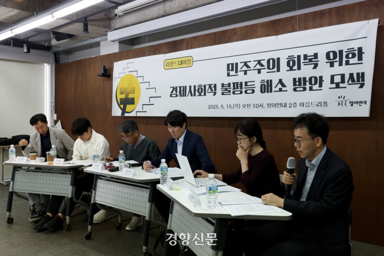 참여연대가 15일 서울 종로구 참여연대 아름드리홀에서 ‘민주주의 회복 위한 경제사회적 불평등 해소 방안 모색’ 토론회를 열고 있다. 문재원 기자