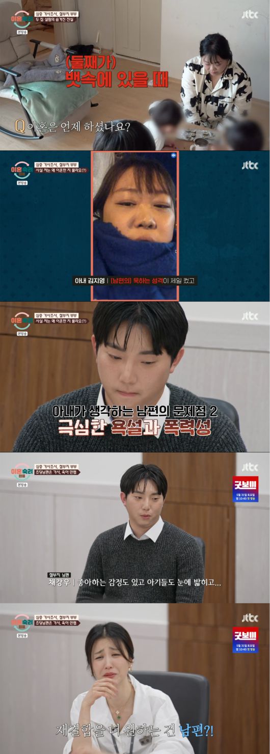 부부는 둘째가 뱃속에 있을 때 이혼을 했다고. 아내는 “(남편이) 욱하는 성격이 제일 컸고 물건을 부수거나 화를 내거나 욕하거나”라며 이혼 사유를 전했다. 남편은 임신중인 아내의 목을 조르기도 했다고 전해 모두를 놀라게 만들었다.