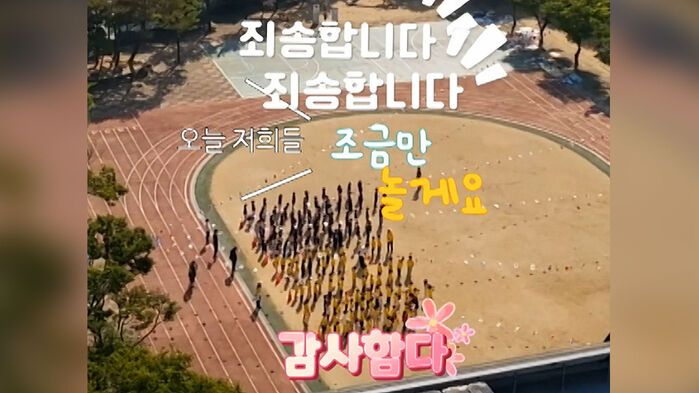 영상에는 운동장에 모인 아이들이 '죄송합니다', '오늘 저희들 조금만 놀게요'라고 큰 소리로 입을 모아 말하는 모습이 담겼습니다.