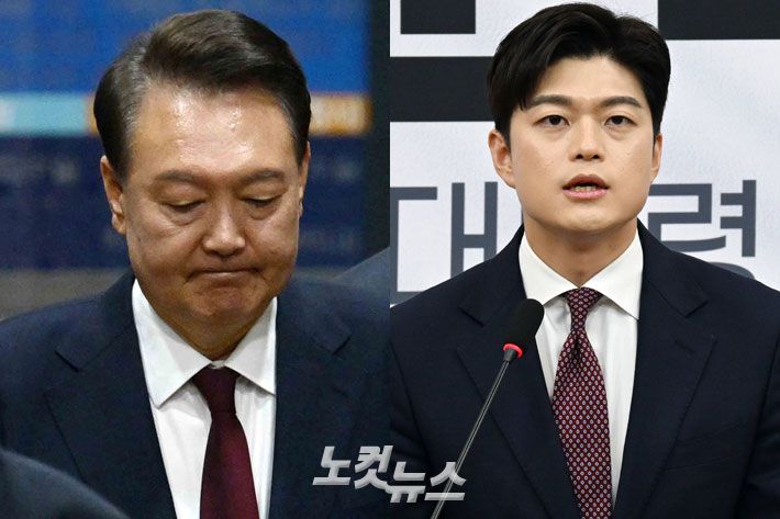 윤석열 전 대통령과 국민의힘 비상대책위원장으로 선출된 김용태 의원. 박종민·윤창원 기자 |