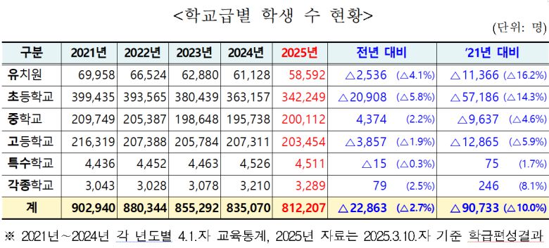 학교급별로 살펴보면 초등학교 학생 수는 34만2249명으로 전년보다 2만908명(5.8%) 줄었다. 고등학교는 20만3454명으로 지난해보다 3857명(1.9%) 감소했다.