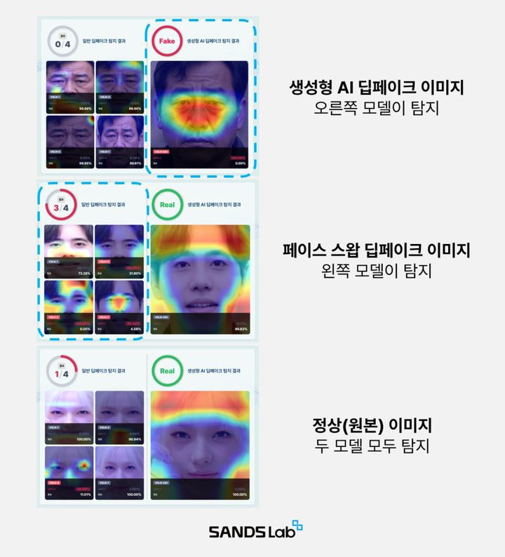 이에 더해 샌즈랩은 '페이스 스왑(Face Swap)' 기술을 이용해 기존의 얼굴을 위·변조한 이미지뿐 아니라 챗GPT 등 생성형 AI가 만들어 낸 가상 인물 이미지까지 구분할 수 있도록 각각의 모델로 고도화해 탐지율을 높였다. 특히 샌즈랩 AI 기술개발팀은 웹 상의 실제 정상 이미지 100장과 GPT-4o를 통해 생성한 딥페이크 이미지 200장을 대상으로 한 자체 테스트에서 99.33%의 정확도(Accuracy)와 99.5%의 F1 스코어를 달성해 우수한 성능을 입증했다.