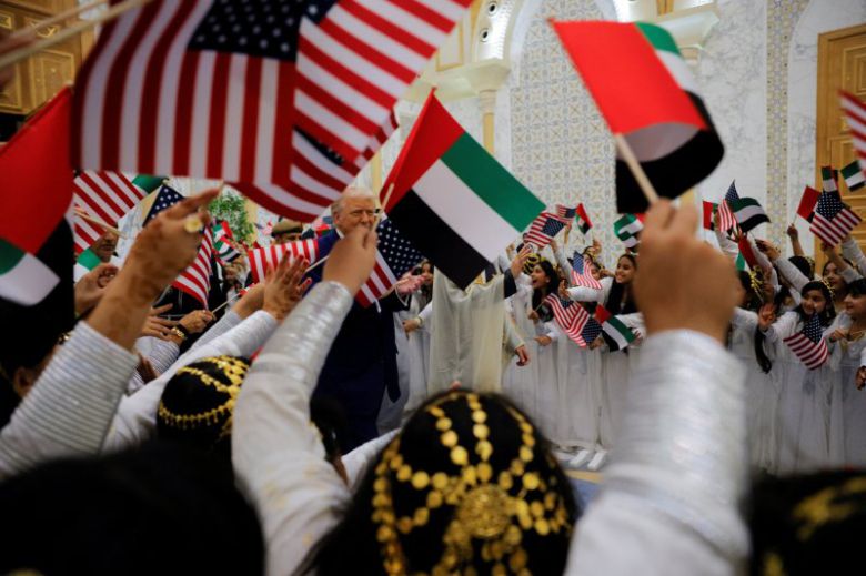 아랍에미레이트(UAE) 국민들이 15일(현지시간) UAE 아부다비에서 열리는 도널드 트럼프 미국 대통령과 셰이크 무함마드 빈 자이드 알나하얀 UAE 대통령의 정상회담 개최를 환영하고 있다. 로이터연합뉴스