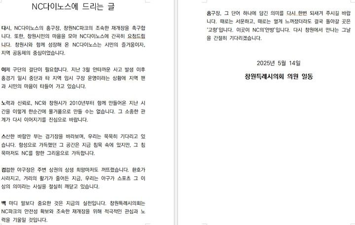 다시, NC다이노스의 홈구장, 창원NC파크의 조속한 재개장을 촉구합니다. 또한, 창원시민의 마음을 모아 NC다이노스에 간곡히 요청드립니다. 창원시와 함께 성장해 온 NC다이노스는 시민의 즐거움이자, 지역 공동체의 중심이었습니다.