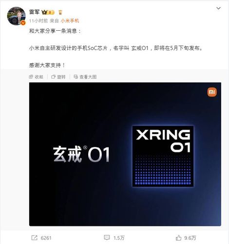 레이쥔(雷軍) 샤오미 최고경영자(CEO)는 지난 15일 밤 웨이보 계정을 통해 "샤오미가 독자적으로 개발한 모바일 시스템 온 칩(SoC)인 '쉬안제O1'(玄戒O1·XringO1)이 5월 하순에 출시된다"고 밝혔다.