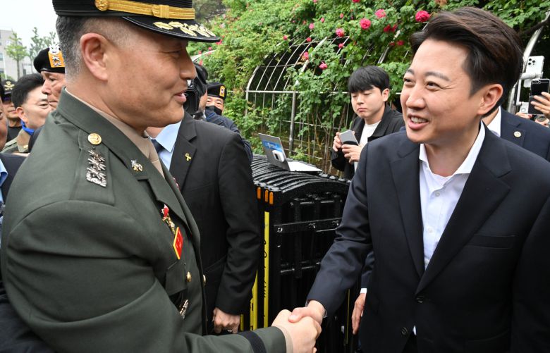 이준석(오른쪽) 개혁신당 대선 후보가 16일 오전 서울 서초구 서울중앙고등법원에서 박정훈(왼쪽) 대령 채상병 사건 관련 2심 준비 공판을 앞두고 열린 기자회견에 참석해 박 대령과 인사를 나누고 있다. 임세준 기자 |