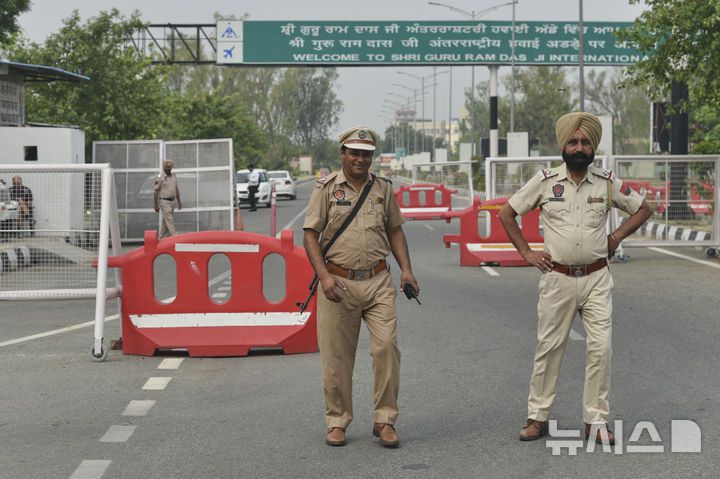[암리차르(인도)=AP/뉴시스]인도 경찰들이 7일 폐쇄된 암리차르 공항으로 가는 도로를 막고 교통을 통제하고 있다. 인도 항공사들이 8일 파키스탄과의 긴장이 고조된 가운데 북부와 서부 지역 24개 이상의 공항에서 운항을 중단했다. 2025.05.08. |