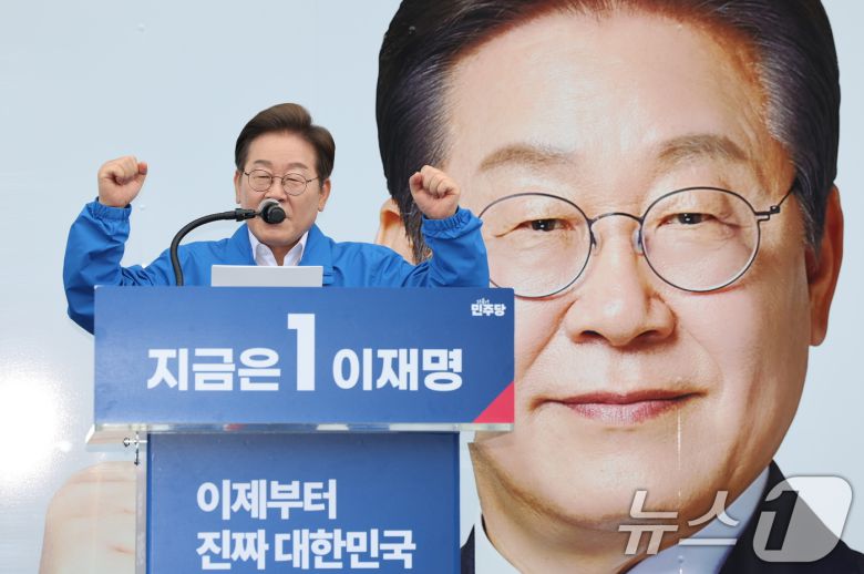 이재명 더불어민주당 대통령 후보가 16일 오전 전북 익산시 익산역 동부광장에서 시민들에게 지지를 호소하고 있다. 2025.5.16/뉴스1 ⓒ News1 이재명 기자 |