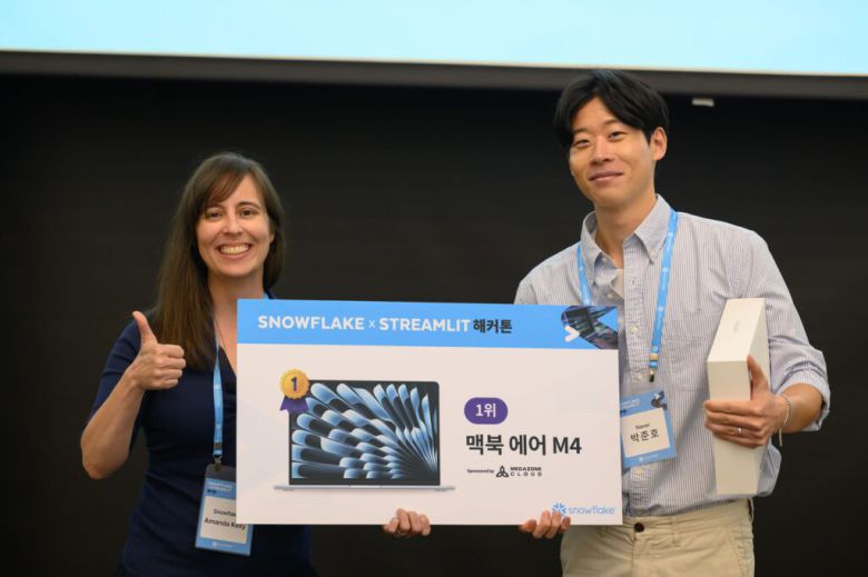 '스노우플레이크 X 스트림릿 해커톤 코리아'가 지난 14일 성황리에 막을 내렸다. AI 데이터 클라우드 기업 스노우플레이크가 주최하고 메가존클라우드가 스폰서로 참여한 이번 행사는 국내 최초로 개최된 데이터 기반 애플리케이션 경연대회로서, 메가존클라우드는 1등 수상자에게 '맥북 에어 M4'를 지원했다.