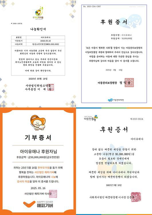 아이유는 데뷔 기념일, 자신의 생일, 연말연시 등 매해 뜻깊은 날마다 ‘아이유애나’ 이름으로 꾸준히 기부하며 선한 영향력을 전해왔다. 지난 3월에는 경상권 일대의 대형 산불 피해 지원과 소방관의 처우 개선을 위해 2억 원을 기부했고, 어린이날에는 아동·청소년을 위해 1억 5천만 원을 기부하며 따뜻한 나눔을 실천한 바 있다.