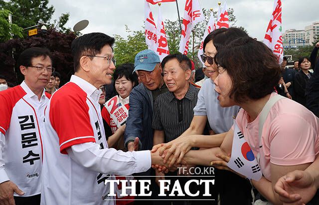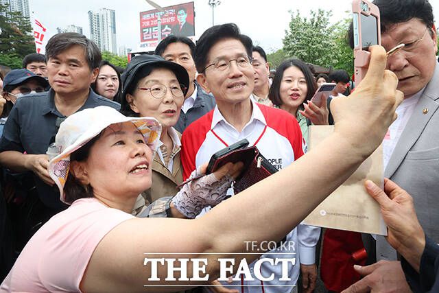 [더팩트ㅣ화성=임영무 기자] 김문수 국민의힘 대통령 후보가 16일 오전 경기 화성시 동탄센트럴파크를 찾아 시민들과 인사를 하고 있다.