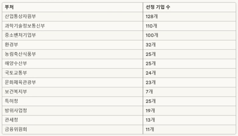 부처별 선정 결과를 살펴보면, 산업통상자원부가 128개로 가장 많고, 과학기술정보통신부 110개, 중소벤처기업부 100개 순으로 나타났다. 산업 분야별로는 전기차·첨단 방산·로봇 등 제조·모빌리티 분야가 116개로 가장 많았으며, AI 분석·빅데이터 관련 인공지능 분야가 80개, 친환경 연료·대체식품 등 환경·스마트 농축수산 분야가 76개로 뒤를 이었다. 선정된 기업의 96% 이상인 492개 기업이 미래유망산업 지원, 첨단전략산업 육성 등 '5대 중점 자금공급분야'에 해당하는 것으로 분석됐다.