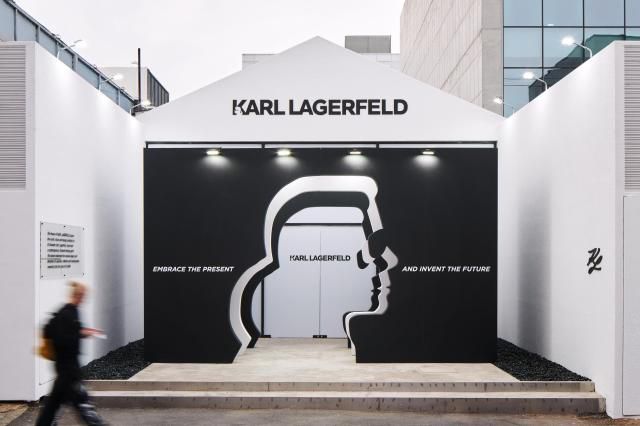 가장 먼저 눈에 띄는 웰컴존은 칼 라거펠트의 트레이드 마크인 백발과 뒤로 묶은 머리, 검은 선글라스를 착용한 옆 얼굴의 실루엣을 문으로 형상화했다. 곳곳에는 그의 명언으로 유명한 ‘현재를 포용하고 미래를 창조하다’가 새겨져 있었다.