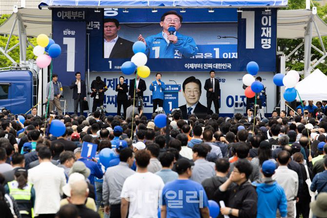 이재명 더불어민주당 대통령 후보가 16일 오후 군산시 구시청광장에서 시민들에게 지지를 호소하고 있다.(사진=뉴스1)