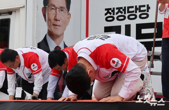 김문수 국민의힘 대선 후보가 16일 오전 경기도 동탄시 센트럴파크에서 열린 집중유세에서 지지를 호소하며 큰절을 하고 있다.