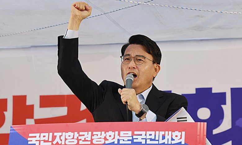 국민의힘 윤상현 의원이 5일 서울 세종대로에서 대한민국바로세우기국민운동본부가 연 광화문 국민대회에 참석해 발언하고 있다. 연합뉴스