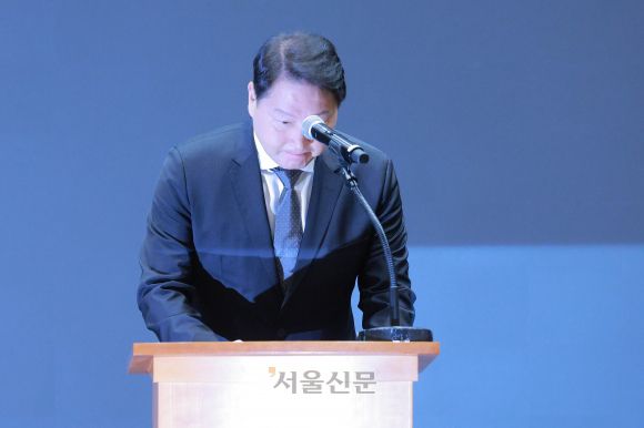 최태원 SK그룹 회장이 7일 오전 서울 중구 SKT타워에서 SK텔레콤 이용자 유심(USIM) 정보 해킹 사고와 관련해 고개숙여 사과하고 있다. 2025.5.7 도준석 전문기자 |