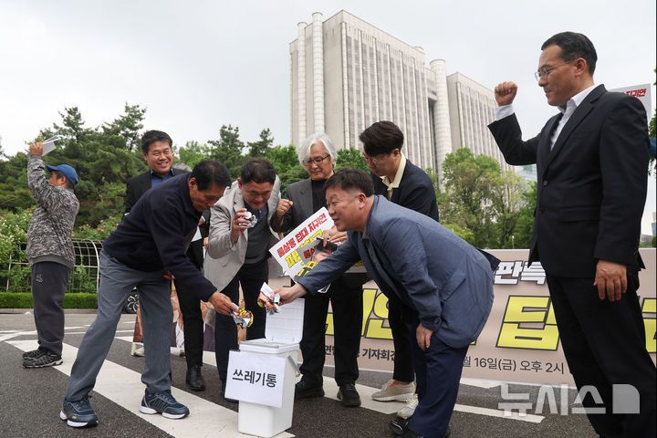 [서울=뉴시스] 김선웅 기자 = 촛불행동, 검사를 검사하는 변호사 모임, 민생경제연구소 등 단체 관계자들이 16일 서울 서초구 서울중앙지법 앞에서 기자회견을 열고 지귀연 판사에 대한 면담을 요구하며 윤석열 전 대통령 재판 특혜, 불법 접대 등 의혹에 대한 해명을 촉구하는 퍼포먼스를 하고 있다. 2025.05.16. mangusta@newsis.com