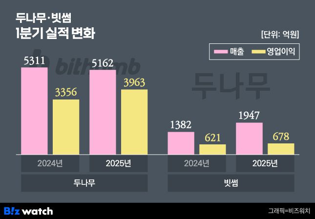 16일 금융감독원 전자공시시스템에 따르면 두나무와 빗썸은 올해 1분기 각각 3963억원, 678억원의 영업이익을 기록했다. 두나무의 1분기 영업이익은 전년동기대비 18.1% 늘었고, 같은기간 빗썸은 9.3% 증가했다. 도널드 트럼프 행정부 2기 출범 후 관세전쟁 등 여파로 투자심리가 위축된 가운데서도 영업이익이 성장세를 기록했다.