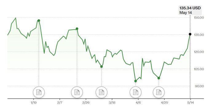 밸류에이션 부담과 관세 전쟁을 둘러싼 우려에 곤두박질 쳤던 주가는 4월21일(현지시각) 96.91달러에서 가파르게 반등하며 5월14일 135.34달러에 거래를 마쳤다. 단기간에 약 40% 급등한 셈이다.