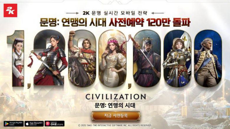 2K는 시드 마이어의 문명 시리즈의 새로운 모바일 전략 게임 ‘문명: 연맹의 시대’의 사전 예약자 수 120만 명을 돌파했다고 오늘(16일) 밝혔다.