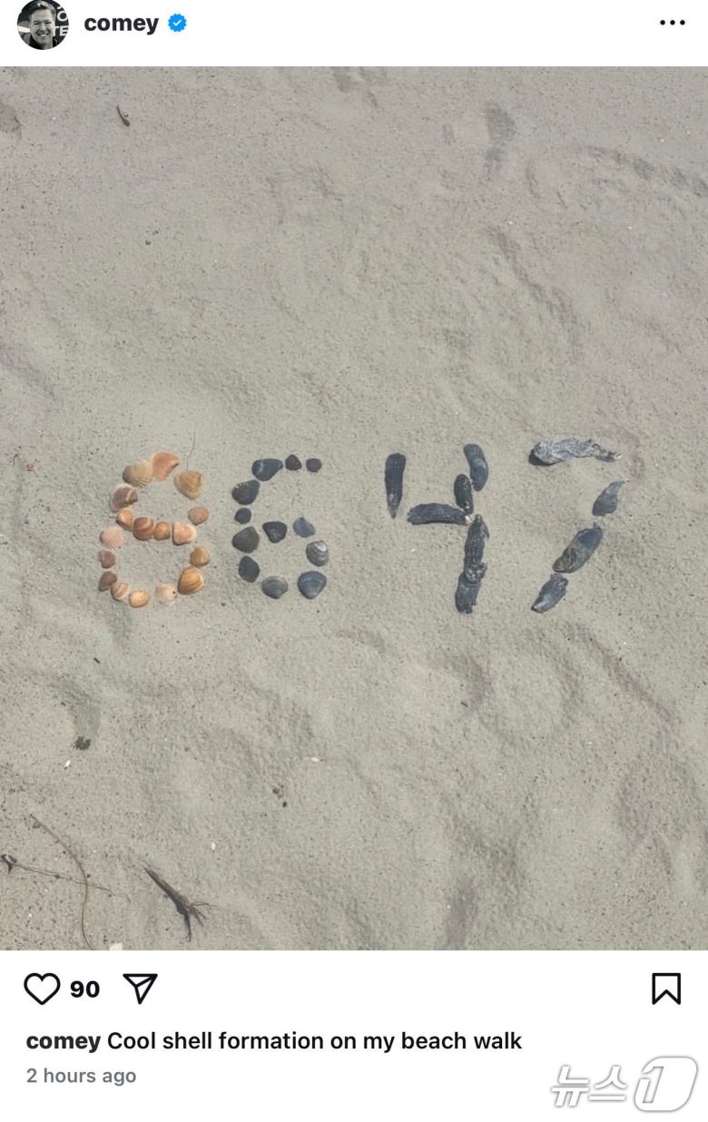 도널드 트럼프 1기 행정부 당시 해임된 전직 미 연방수사국(FBI) 국장이 해변에서 조개껍데기로 배열한 숫자 사진을 사회관계망서비스(SNS)에 올렸다.