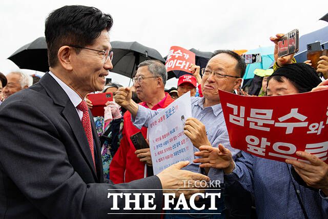 [더팩트ㅣ세종=임영무 기자] 김문수 국민의힘 대선 후보가 16일 국회 세종의사당 부지에서 행정수도 공약을 발표하기에 앞서 꽃다발을 받고 기념촬영을 하고 있다.