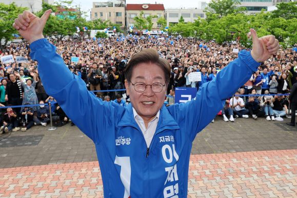 이재명 후보, 군산에서 엄지척 - 이재명 더불어민주당 대선 후보가 16일 전북 군산시 구시청광장에서 열린 유세에서 엄지를 들어 보이고 있다. 군산 연합뉴스