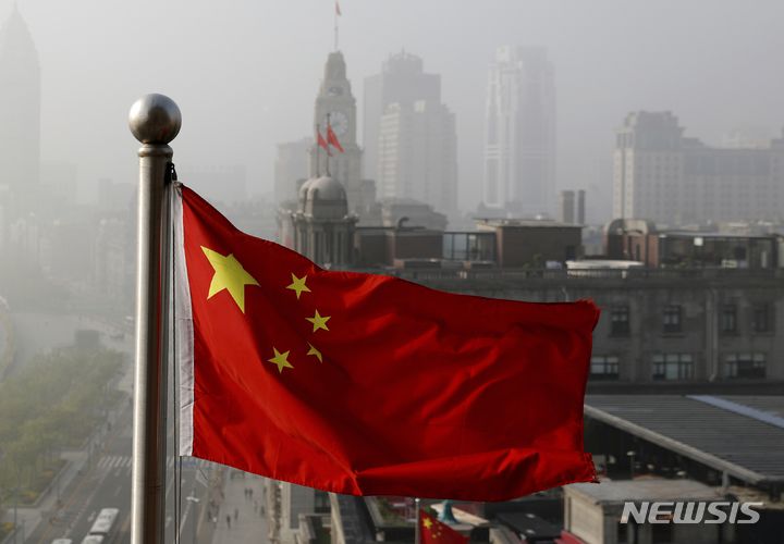 [베이징(중국)=AP/뉴시스] 2016년 4월 14일 중국 상하이의 사무실 건물에 중국 국기가 펄럭이고 있다. 2025.05.16 |