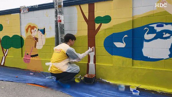 HDC현대산업개발이 서울 용산구 지역 교육 환경 개선을 위해 지역 주민들과 용강중학교 담장 벽화 그리기 봉사활동에 나섰습니다.
