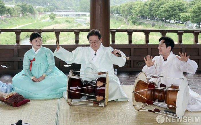 [전주=뉴스핌] 김학선 기자 = 이재명 더불어민주당 대선 후보가 16일 오후 전북특별자치도 전주시 와산구 청연루에서 K-컬처 ‘전통의 소리를 잇다-청년 국악인과의 간담회‘에 참석해 김한샘 판소리고법 이수자로부터 장구를 배우고 있다. 2025.05.16 yooksa@newspim.com
