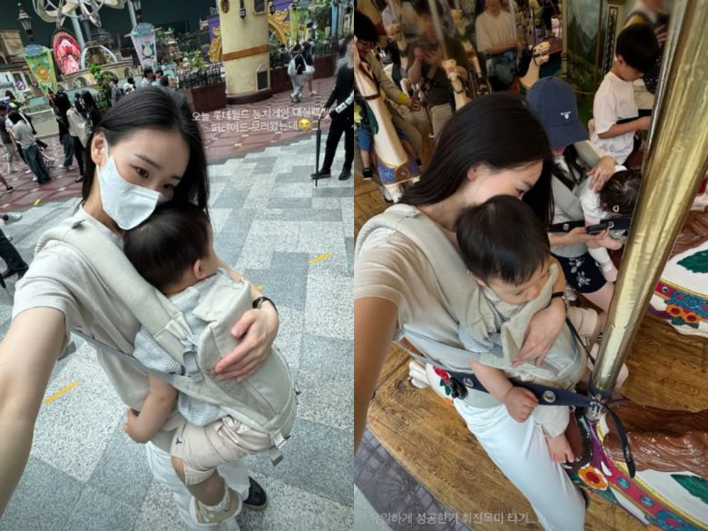 사진 속 손연재는 마스크를 쓰고 놀이동산을 방문한 모습. 특히 아기띠를 앞으로 메고 있는 손연재는 육아에 지친 듯한 표정을 짓고 있어 엄마들의 공감을 자아냈다.