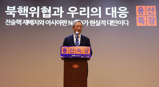정몽준 아산정책연구원 명예이사장이 16일 전쟁기념관 이병형홀에서 열린 용산특강에서 북핵위협과 우리의 대응을 주제로 강연하고 있다. 연합뉴스 |