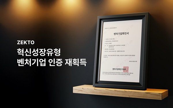 관광 및 핀테크 분야 융합 플랫폼 개발 기업 ㈜젝토(ZEKTO, 대표 차세영)가 중소벤처기업부 주관 혁신성장유형 벤처기업 인증을 최근 재획득했다고 16일 밝혔다.