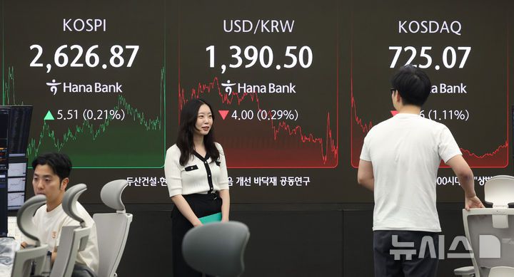 [서울=뉴시스] 김진아 기자 = 16일 서울 중구 하나은행 딜링룸에서 딜러들이 업무를 보고 있다. 코스피는 전 거래일(2621.36)보다 5.51포인트(0.21%) 상승한 2626.87에, 코스닥 지수는 전 거래일(733.23)보다 8.16포인트(1.11%) 내린 725.07에 거래를 마무리했다. 서울 외환시장에서 원·달러 환율은 전 거래일 주간거래 종가(1394.5원)보다 4.9원 내린 1389.6원에 주간 거래를 마쳤다. 2025.05.16. bluesoda@newsis.com |
