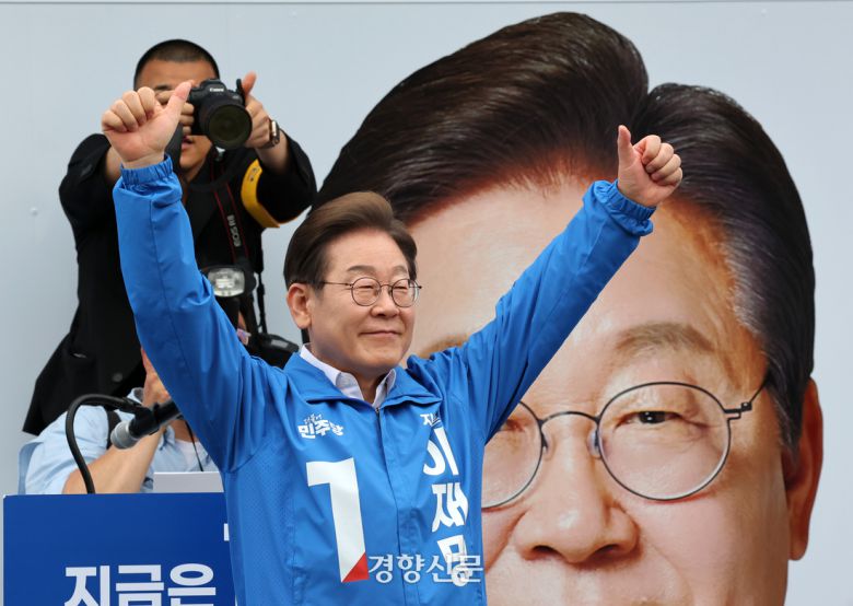 이재명 더불어민주당 대선 후보가 16일 전북 익산역 동부광장 유세에서 손을 들어 인사하고 있다. 박민규 선임기자