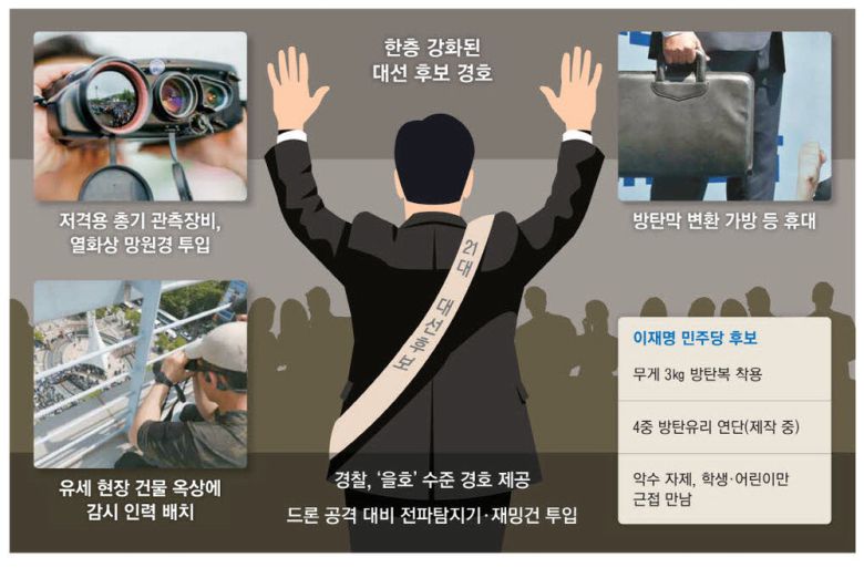 이 후보 유세 현장은 근접 경호팀, 외곽 경계팀, 고지대 감시팀 등 3중 경호가 이뤄지고 있다. 실제 지난 13일 대구 유세 현장에선 총격 등 원거리 위협에 대비해 건물 옥상 등에 배치된 경호 인력이 다수 눈에 띄었다.