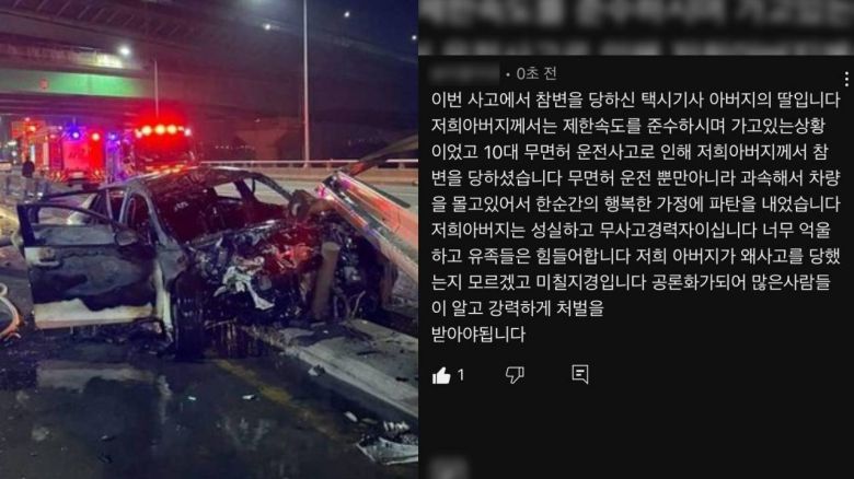 A씨는 "무면허 운전사고로 인해 저희 아버지께서 참변을 당하셨고 한순간 행복한 가정이 파탄 났다"며 "성실하고 무사고 경력자였던 아버지가 왜 사고를 당했는지 모르겠고 미칠 지경이다. 너무 억울하고 힘들다"고 호소했다.