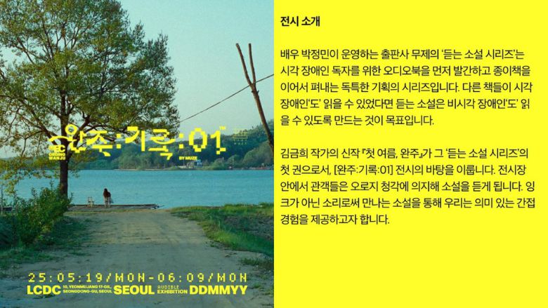 '완주:기록:01'은 시각 자극을 최소화한 암실 속에서 오직 청각에 의존해 오디오북을 감상하는 몰입형 전시로, 관람객에게 새로운 독서 경험을 제공한다. 이번 작품은 무제의 '듣는 소설 프로젝트'의 첫 번째 시도로, 처음부터 오디오북을 염두에 두고 집필됐으며, 출간 전 국립장애인도서관에 기증된 후 일반 독자에게 공개됐다. 오디오북 내레이션에는 고민시, 염정아, 배성우 등 실력파 배우들이 참여해 문학과 연기의 경계를 허문다.