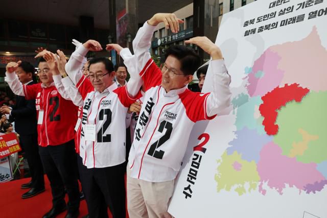김문수 국민의힘 대선 후보가 16일 충북 청주 올리브영 청주타운 앞에서 집중 유세 도중 충북 지역 발전을 약속하며 머리 위로 하트를 그려 보이고 있다. 청주=공동취재사진 연합뉴스