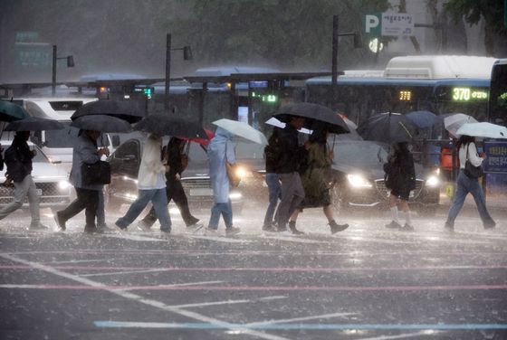 오늘(16일) 서울 광화문사거리에서 시민들이 우산을 쓴 채 이동하고 있다. 〈사진=연합뉴스〉 |