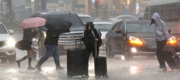 폭우가 쏟아진 16일 오후 서울 중구 퇴계로에서 시민들이 빗속을 뚫고 걸어가는 모습./사진=뉴시스 |