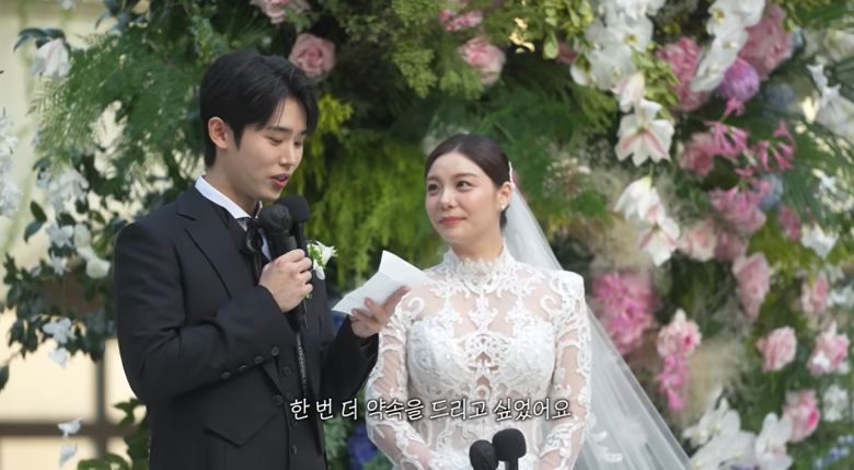 이어 신랑 최시훈의 깜짝 이벤트가 이어졌다. 양복 안주머니에서 준비한 편지를 꺼낸 그는 "제가 굉장히 내성적이어서 와이프가 여러가지 해달라고 했던 게 있었는데 아무것도 못 해줘서 너무 미안하기도 해서 작은 이벤트 준비했다"고 말문을 열었다.