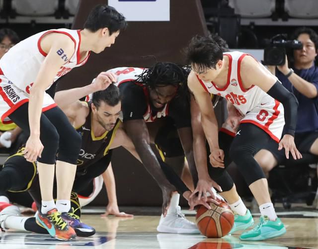 프로농구 서울 SK와 창원 LG 선수들이 15일 경남 창원체육관에서 열린 2024~25 챔피언결정전 6차전 도중 치열한 볼다툼을 벌이고 있다. 창원=뉴스1 |