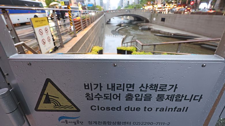 ▲ 서울 대부분 지역에 호우주의보가 내려졌던 16일 서울 청계광장 인근 청계천 산책로 입구 출입이 통제되고 있다.