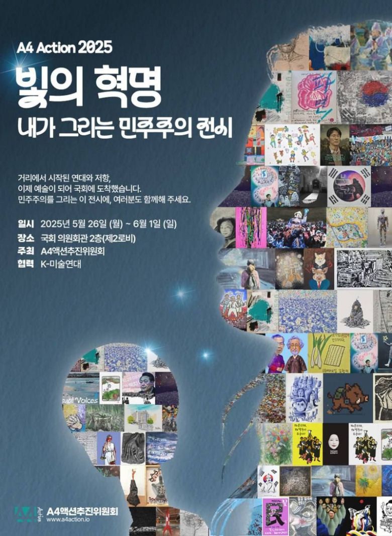 A4액션추진위원회는 26일부터 다음 달 1일까지 국회의원회관에서 'A4 Action 2025 : 빛의 혁명, 내가 그리는 민주주의' 전시를 연다고 밝혔습니다.