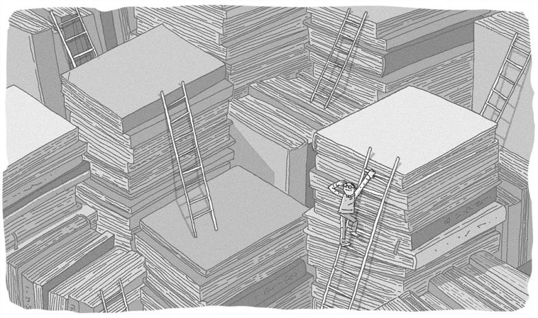 집 모든 곳에 장서가 쌓이면 집이 미로(迷路)가 된다. 수만 권 장서가 모든 생활 공간을 침범하면서 비어 있는 공간은 침대만 남는다. 시간이 흘러 언제 굴러떨어질지 모르는 책의 벽이 침대조차 위태롭게 포위한다. 책이 주인이 되고 사람이 객(客)이 된다.